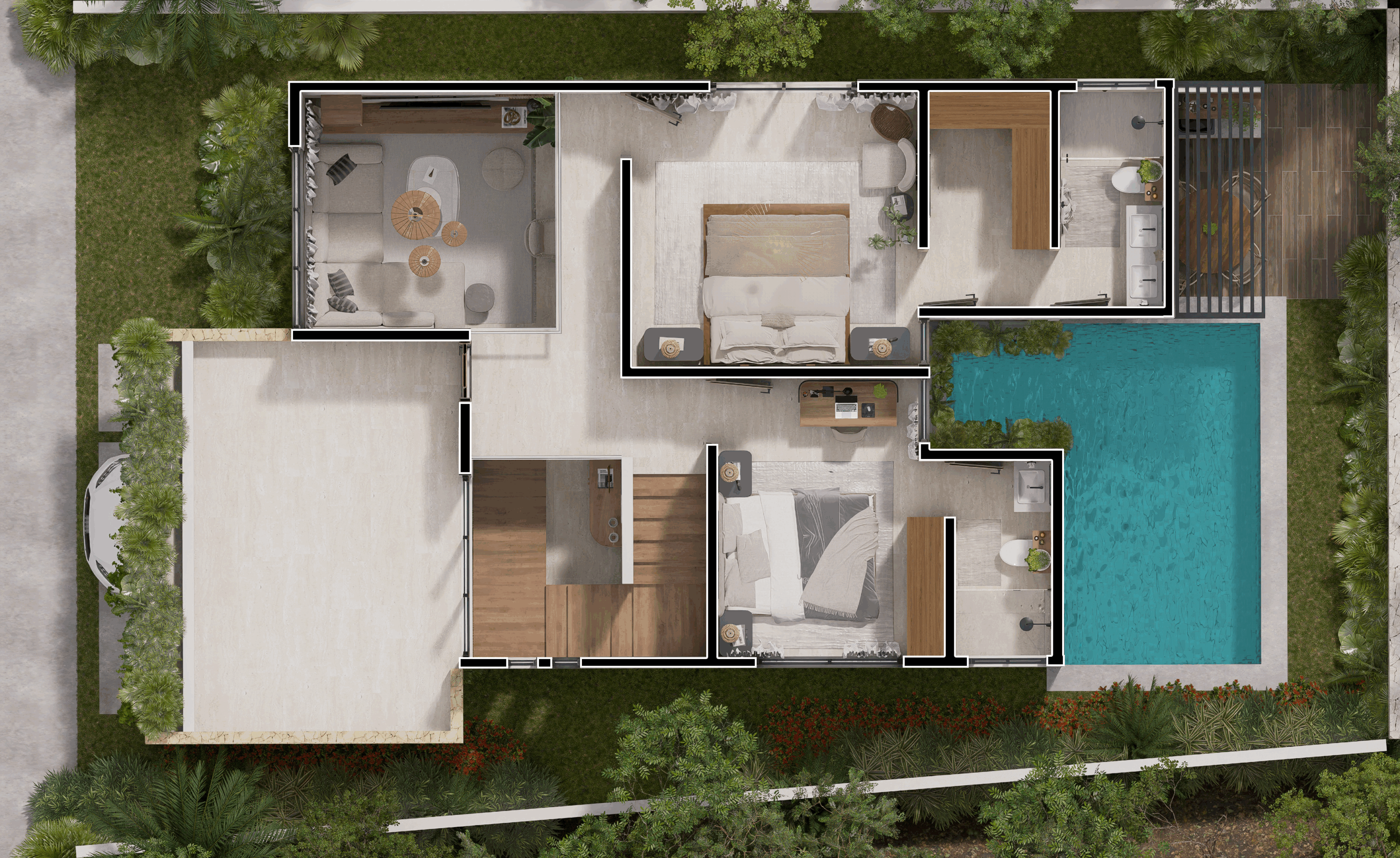 Casa Ceiba, located in the private Baiché residential community within Tulum Country Club, offers the perfect blend of comfort and exclusivity. With a two-level design, it maximizes both indoor and outdoor living, creating a fluid connection with its surroundings on a 180 m² lot and 177 m² of construction.