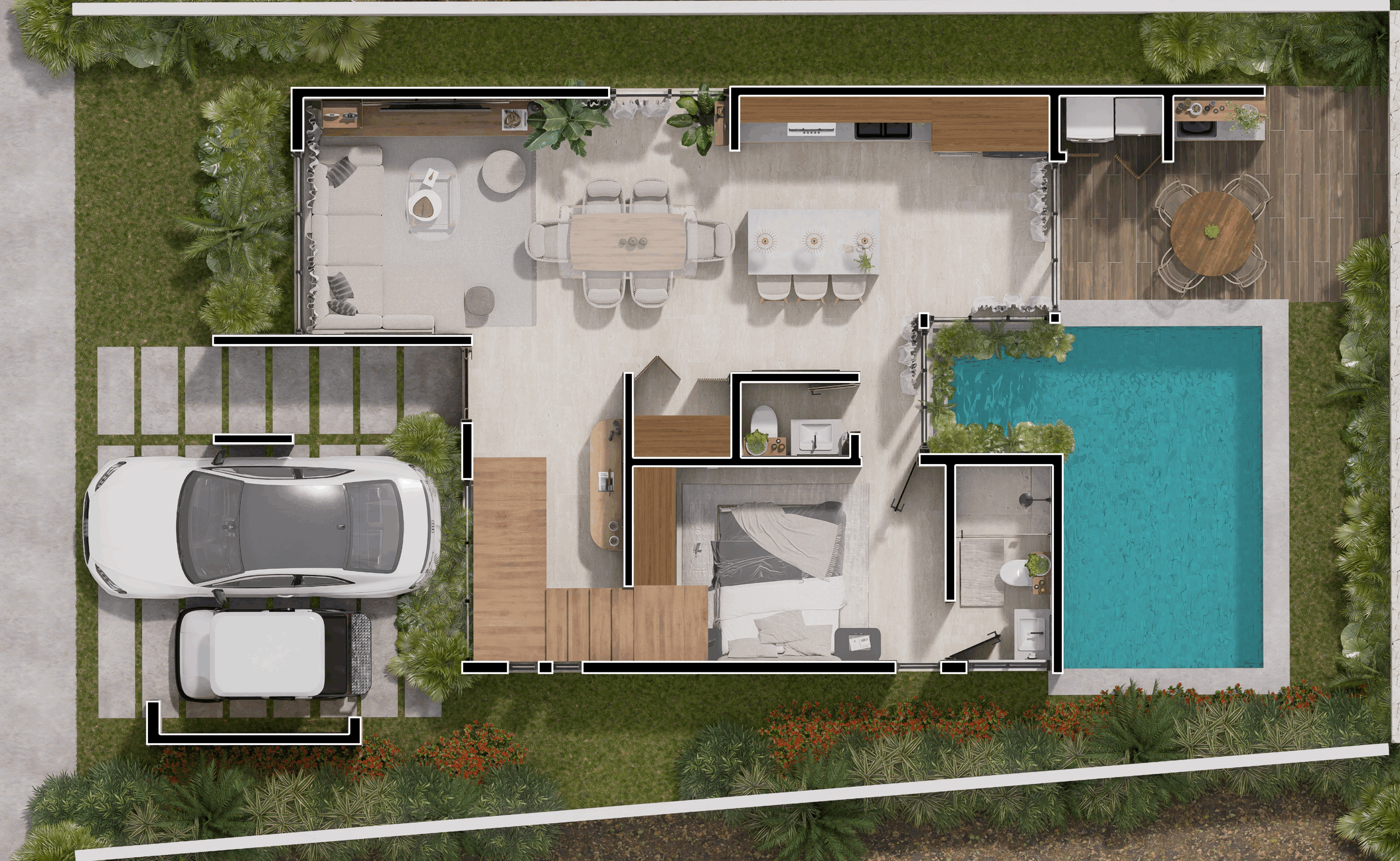 The open-concept social area with double-height ceilings connects to a covered terrace, featuring a BBQ and direct access to the private pool. The garden provides a serene space to relax or entertain. The home also includes parking for a car and a golf cart, ensuring convenience within the community.